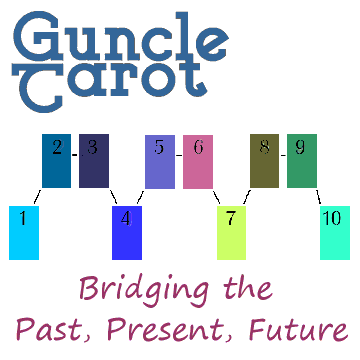 Expanding the traditional 3 card Past, Present, Future reading. The bridging cards (#3,6,9 are non-Tarot) reflect “events, beliefs, influences you might not be aware of“.